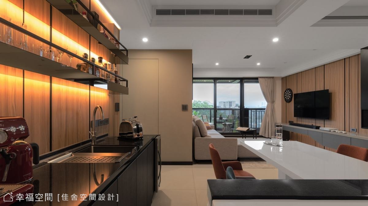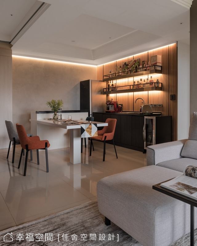 40平居宅,在有限工時及不變動格局下,仍展呈出簡約時尚質感,整體空間走現代居家風,以快速的輕裝潢,達到現代風格設定。業主為酒商,因此規劃了調酒吧台、多功能大中島為一進門主視覺,串聯到開闊流線電視牆,不僅具備收納機能也展現氣度。